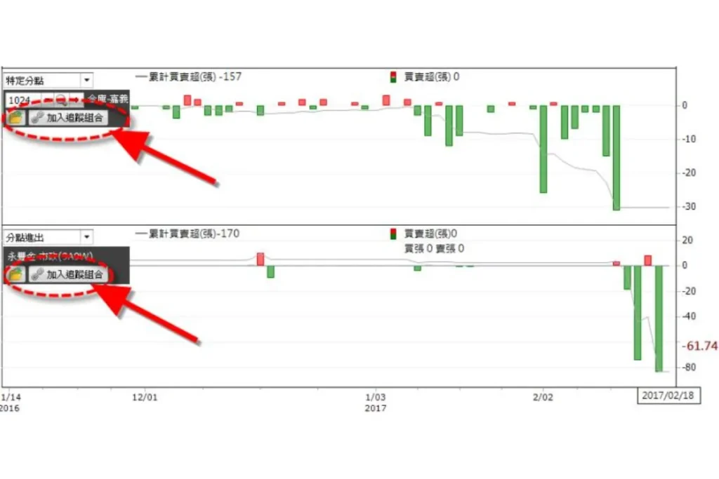 在副圖『分點進出』、『特定分點』中,都可以看到『加入追蹤組合』的按鈕。