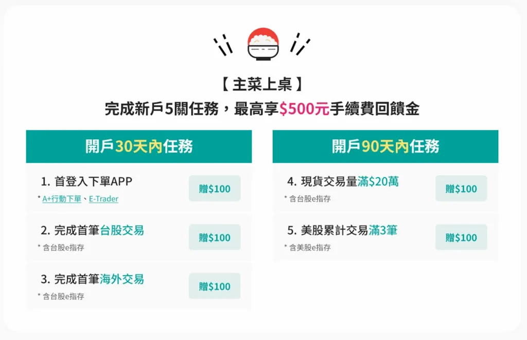 - 「投資大富翁」新戶任務禮:2025/10/1~12/31 活動期間,新開戶的投資人完成指定交易任務最高可獲得 NT$500 手續費回饋金。
