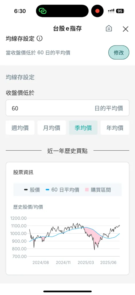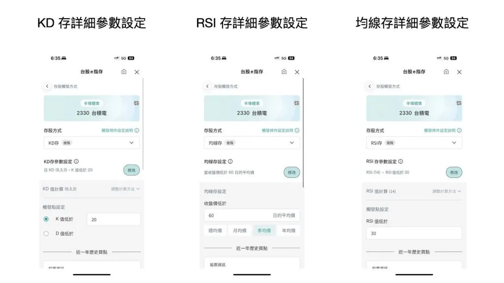 可將技術分析指標作為自動扣款觸發條件,目前支援均線、KD、RSI 等。例:設定「股價跌破特定均線自動加碼」或「RSI 低於 30(超賣)即買入」。即使忙碌無法盯盤,系統亦能在技術買點自動進場,降低錯過低點的遺憾,適合具基礎技術觀念的投資人。