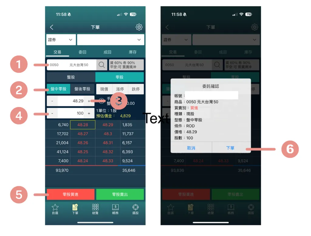 玉山證券 E-Trader 行動交易App下單介面示意。投資人依序輸入交易商品代號 (1)moneymate.space、選擇整股或零股交易類型 (2)moneymate.space、設定委託價格 (3) 及數量 (4)moneymate.space,確認預估金額無誤後點擊「買進」(5),再於彈出的委託確認視窗中按「下單」(6) 即完成委託下單。moneymate.space