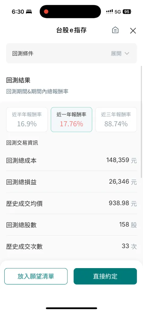 完成條件設定後,可用歷史回測檢視過去半年/一年/三年的模擬成果,包含累計投入、總盈虧、報酬率、平均成交價與交易次數等。回測有助評估策略有效性並微調參數,提升長期執行的信心。