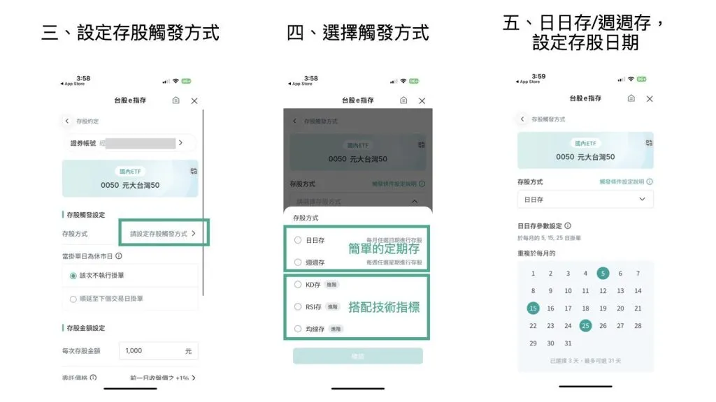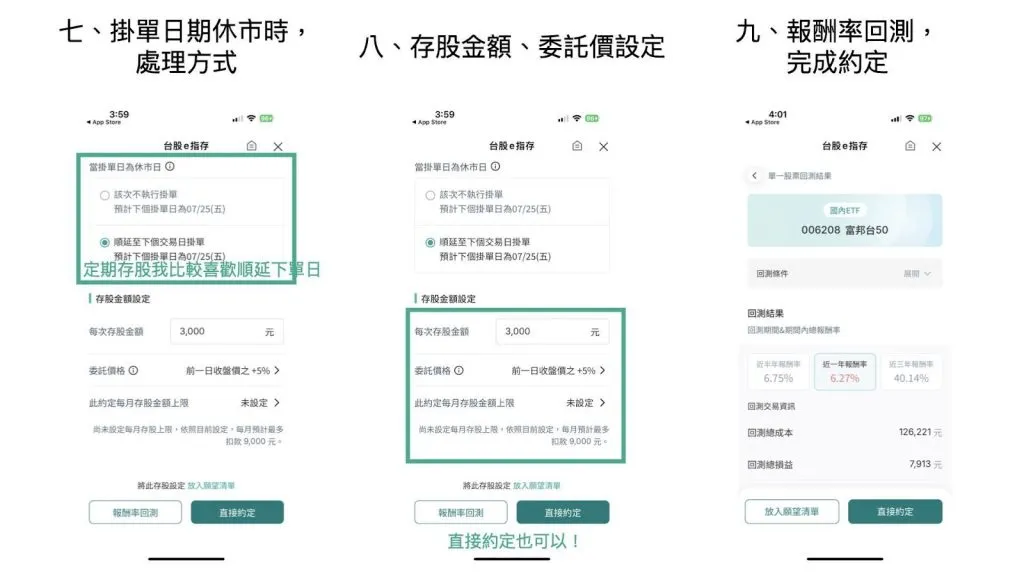 您可彈性設定扣款頻率,如「日日存」(每月指定幾天自動下單)或「週週存」(每週指定星期幾下單)。例如:設定每月 15 日定期扣款買入台灣 50 ETF 5,000 元,或每週三買入台積電 8,000 元,系統即會在該時間自動下單;若遇非交易日,亦可選擇是否順延至下一交易日,確保投資計畫不中斷。