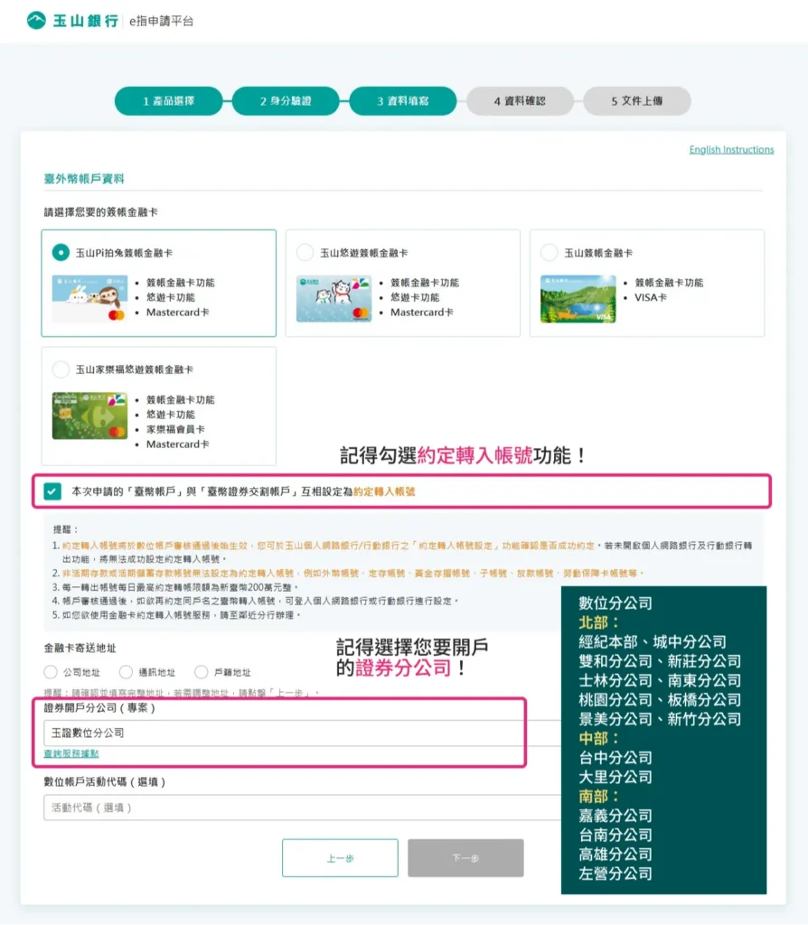 選擇是否申請玉山銀行金融卡,以及您希望掛勾的證券開戶分公司據點。