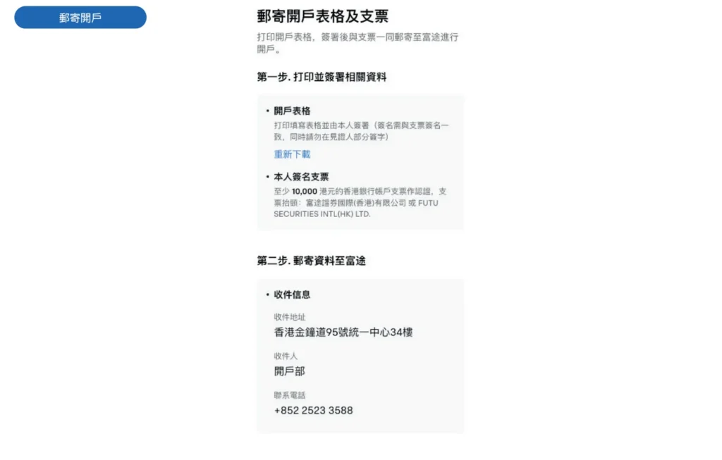 申請人可以郵寄開戶表格及支票到富途證劵辦公室。
