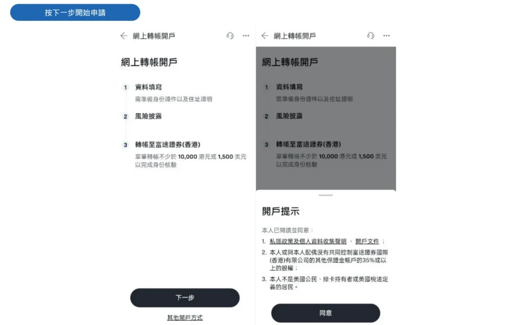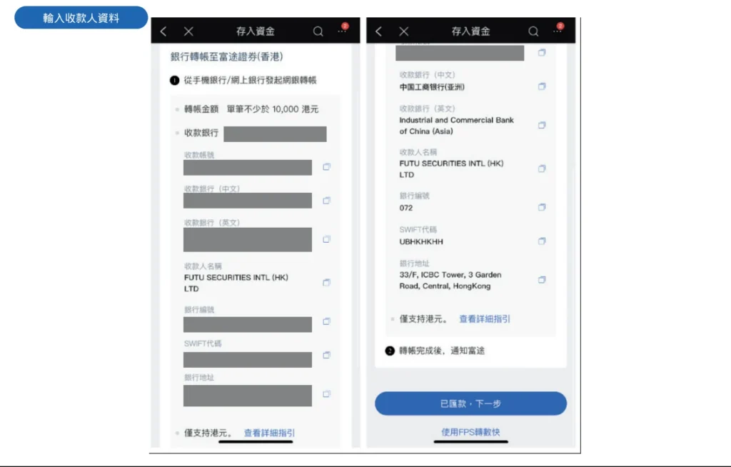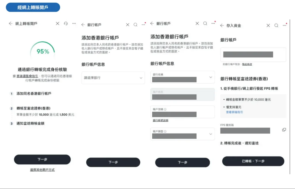 輸入戶口資料,並轉帳 HK$10,000 至富途證劵以完成身份認證。
