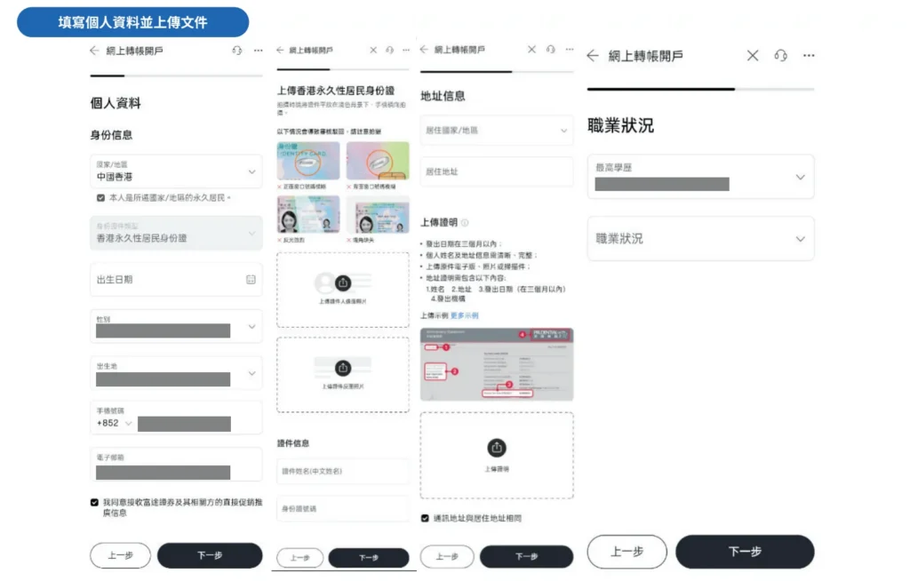 填寫個人資料、上傳身份證明文件和地址證明並填寫職業狀況。