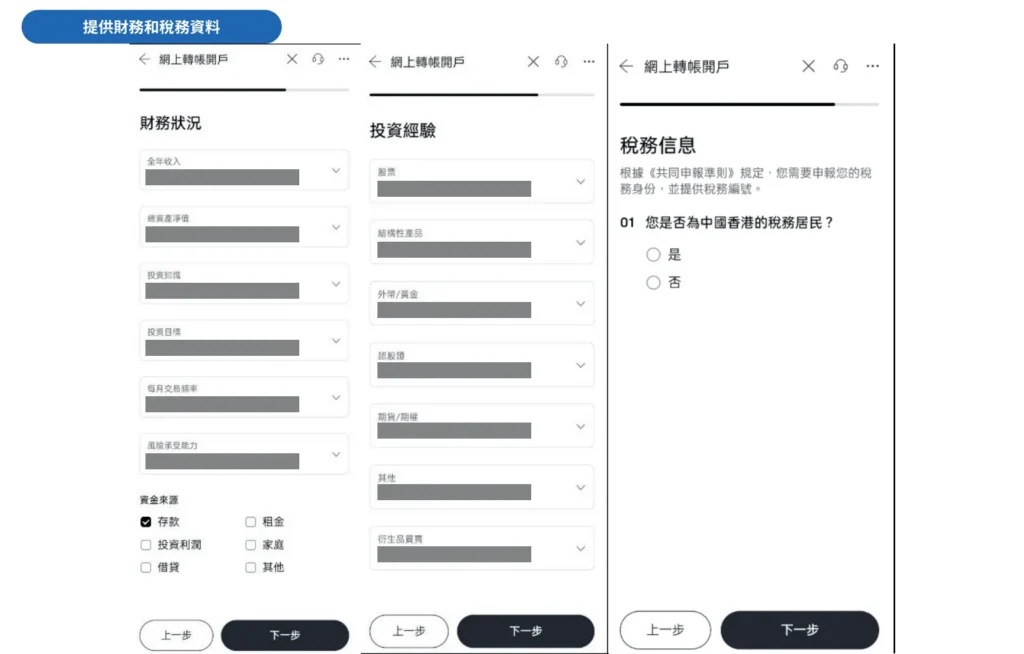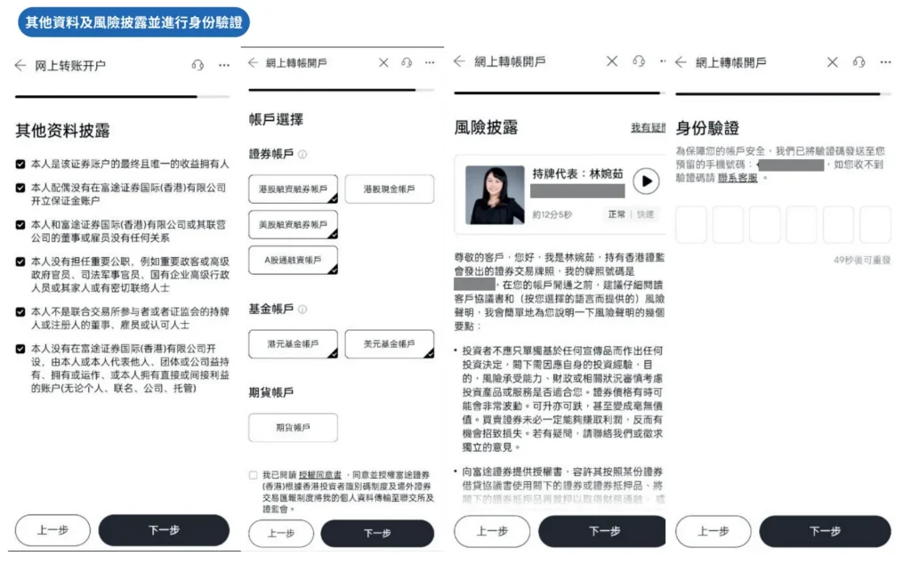 閱讀其他資料、選擇帳戶及閱讀風險聲明並進行身份驗證。