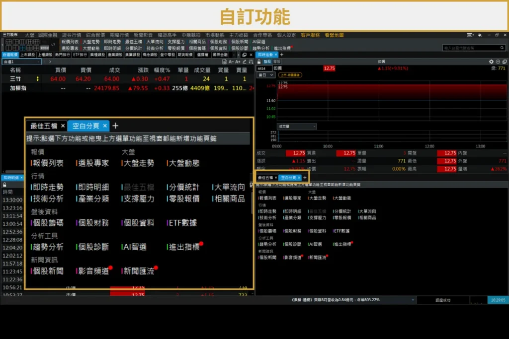 - 建議把常用面板固定於主畫面(如:分時、五檔、新聞、分點、技術圖),形成個人工作站。