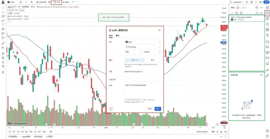 - 警報與快訊提醒: 您可以設定價格警報(Alert),當行情達到特定價格或技術條件時,TradingView 會通過手機推播、電子郵件等方式通知您,避免錯過交易良機。即使關閉瀏覽器,警報也由伺服器端持續監控。免費用戶有少量警報額度,升級付費方案則可建立更多即時快訊提醒。