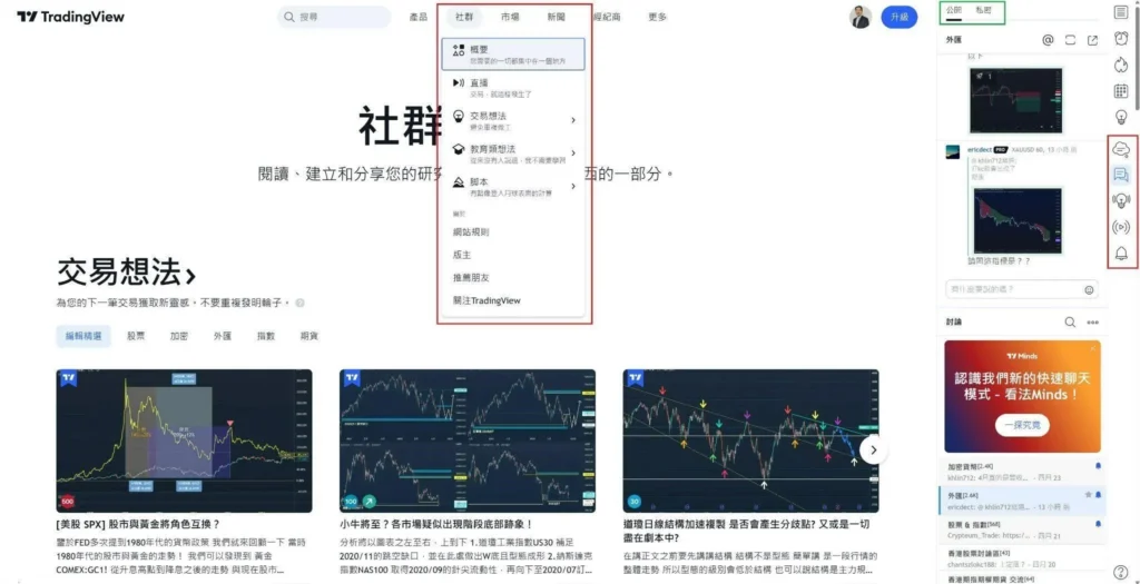 - 雲端同步與社群互動: 所有設定和圖表都儲存在雲端,登入帳號即可跨裝置同步資料。TradingView 還具備社群功能,使用者可以發表交易觀點(Ideas)、關注其他高手的分析,或在聊天室討論。這種社群互動讓學習技術分析更有趣也更具實戰經驗分享。