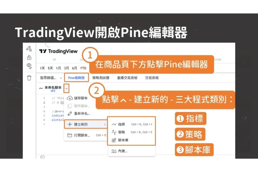 Pine Script 是 TradingView 自家的輕量級編程語言,設計用來撰寫技術指標或交易策略。您可以在 TradingView 圖表頁面的下方或側欄,找到「Pine 編輯器」,點擊即可開啟腳本編輯介面。對初學者而言,可以先從修改官方提供的簡單腳本或別人共享的腳本開始。